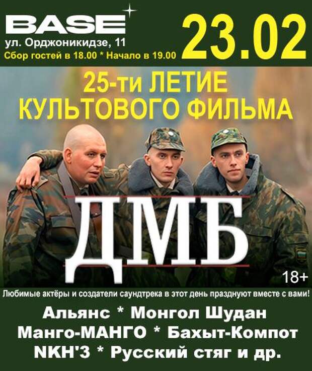 Кинофильм «ДМБ» вышел на экраны страны в далёком 2001 году и практически сразу обрёл статус культового. Сюжет был построен как серия новелл и анекдотов, отражающих армейский быт и реалии того времени, что было своевременно, интересно и при всей иронии патриотично. Кино разлетелось на цитаты, которые прочно вошли в народ, а сочетание высокого слога, черного юмора, армейского фольклора, отсылки к Пелевину и советской классике высоко оценены кинокритиками.